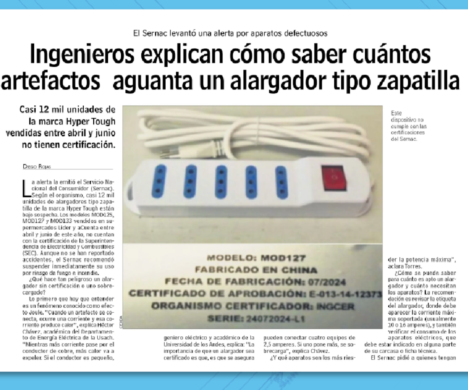 DIE en los Medios, Medios 24 Jun 2025 Ingenieros explican cómo saber cuántos artefactos aguanta un alargador tipo zapatilla – Dr. Héctor Chávez para Las Últimas Noticias El Dr. Héctor Chávez, académico del Departamento de Ingeniería Eléctrica de la Universidad de Santiago de Chile, nos advierte en… Ashley Gómez Ceballos