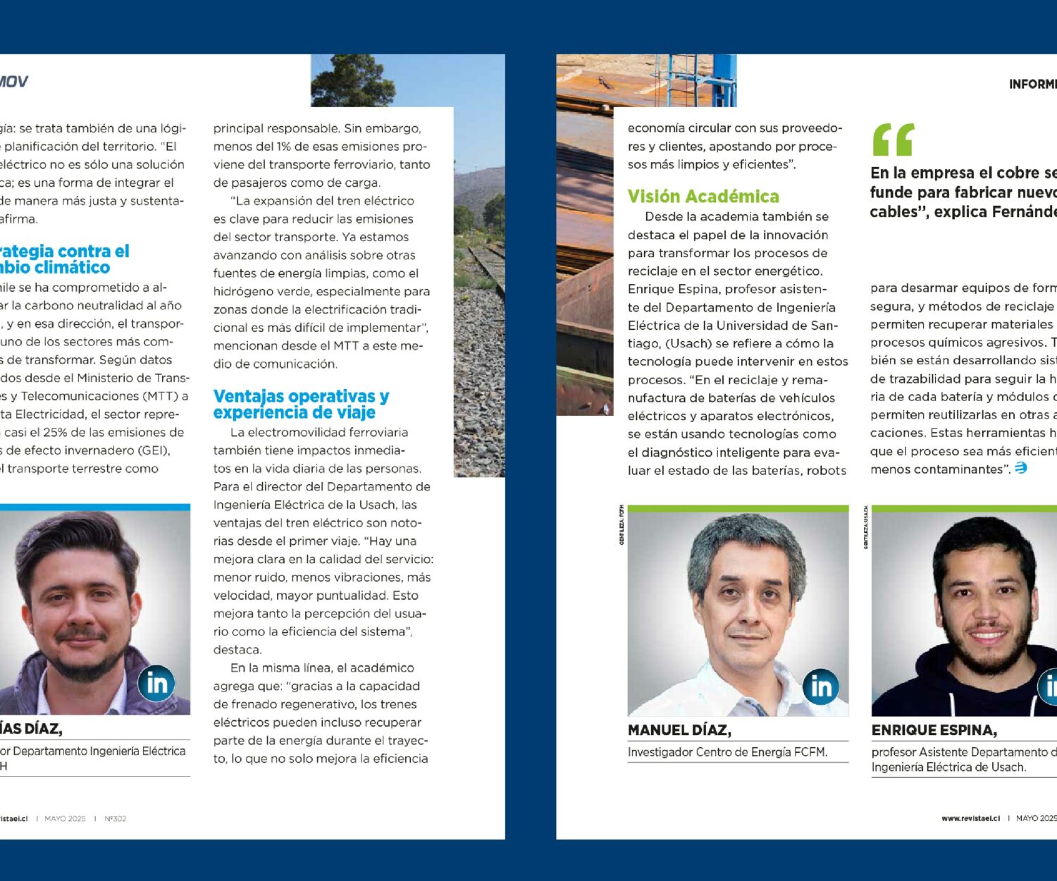 DIE en los Medios 03 Jun 2025 Reciclaje en el sector energético y electromovilidad ferroviaria en Chile En dos artículos de la Revista Electricidad, los académicos del DIE Dr. Matías Díaz y Dr. Enrique Espina, abordaron las… Equipo Comunicaciones DIE