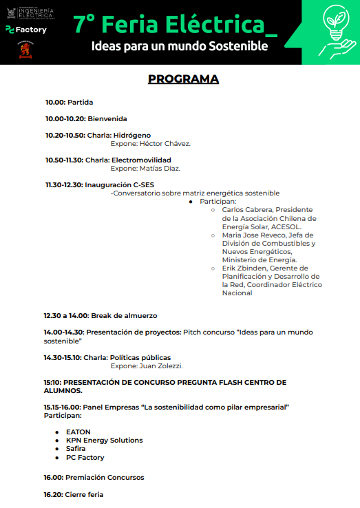 Les invitamos a participar de la septima version de nuestra Feria Eléctrica que se realizara el 23 de noviembre en la explanada del Departamento de Ingeniería Eléctrica (Av. Víctor Jara Nº 3519), desde las 10:00 a 16:20 hrs.[/vc_column_text][/vc_column][/vc_row]