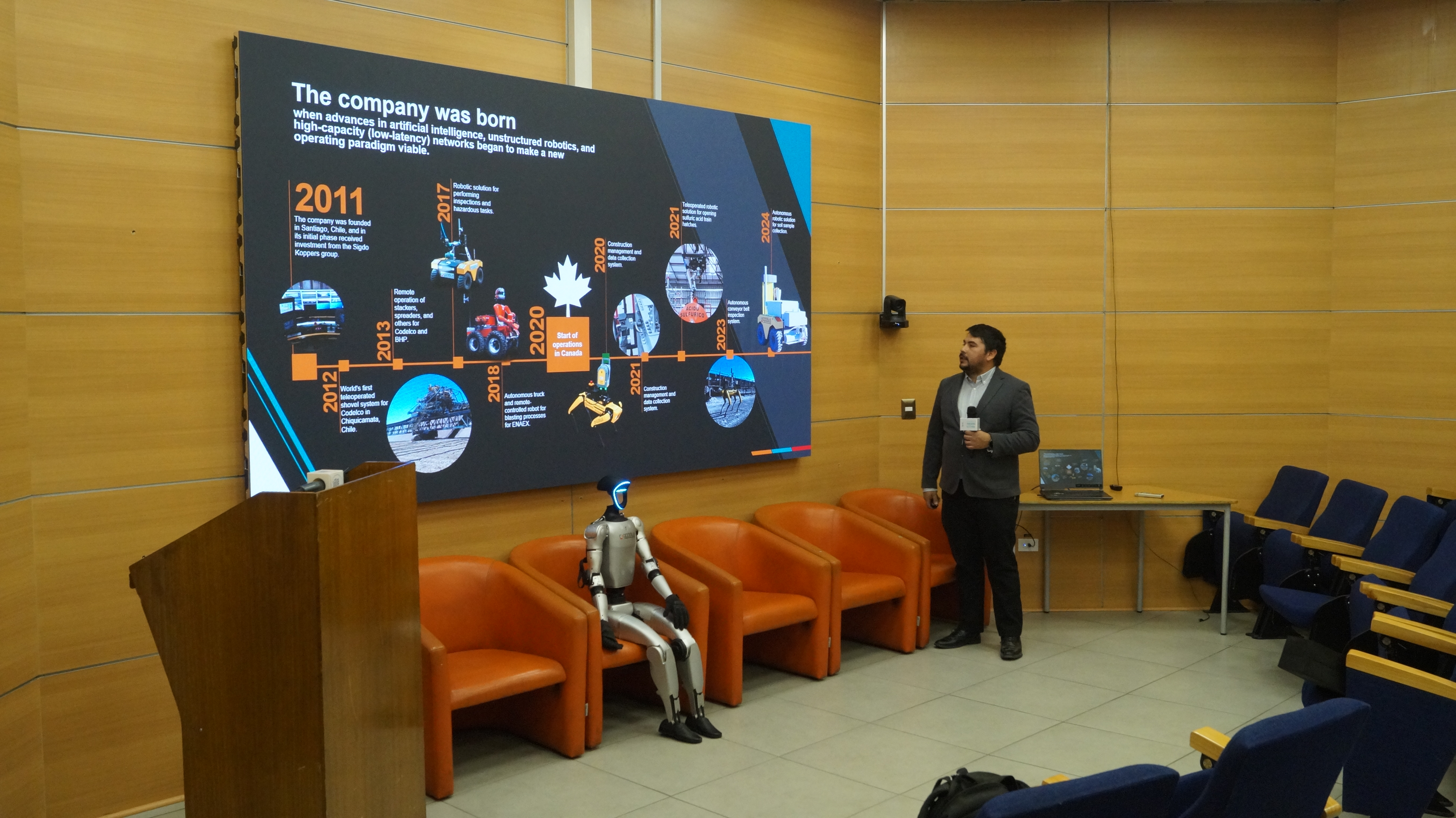 Este martes 13 de mayo se llevó a cabo la charla “Inspección Robotizada de Activos en Minería”, presentada por Tomás De la Cuadra, egresado del DIE y actual Ingeniero de Proyectos en SK-Godelius, empresa especializada en robótica aplicada a la minería. La actividad permitió conocer en detalle cómo las telecomunicaciones y la automatización permiten desarrollar sistemas robóticos capaces de operar en condiciones extremas, realizando inspecciones remotas de manera segura y eficiente. “Volver al Departamento con estos desarrollos es muy significativo, un gran orgullo. En Godelius trabajamos en robótica para entornos no estructurados, y cada solución que aplicamos en terreno nos recuerda que el futuro de la minería se está construyendo hoy, desde la ingeniería”, señaló el expositor.
